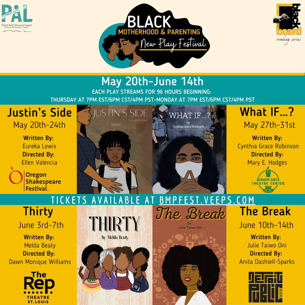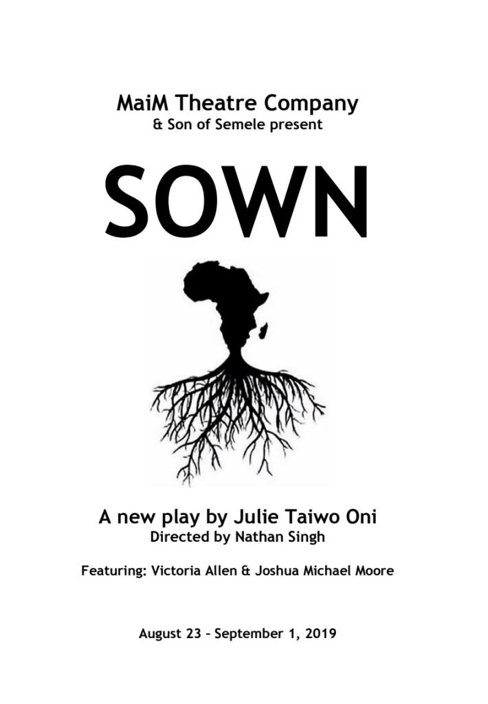 BOLA Blue-Eyes poster. Art by Sarah Akinterinwa. (2021)From BOLA Blue-Eyes. Art by Sarah Akinterinwa. (2021)From BOLA Blue-Eyes. Art by Sarah Akinterinwa. (2021)From BOLA Blue-Eyes. Art by Sarah Akinterinwa. (2021) Black Motherhood and Parenting New Play Festival poster. (2021) Black Motherhood and Parenting New Play Festival poster. (2021) CTG Writer’s Workshop Retreat. (2022)CTG Writer’s Workshop members. (2022) Poster for SOWN. (2019) Playbill for SOWN. (2019) Joshua Michael Moore and Victoria Allen in SOWN. (2019)